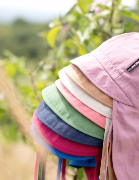 Il cappello è dotato di due cinturini per evitare che scivoli, di un paracollo per proteggersi dal sole e offre anche una protezione UV alta, pari a 50+ nelle colorazioni rosa e blu e pari a 20+ nella colorazione lilla.