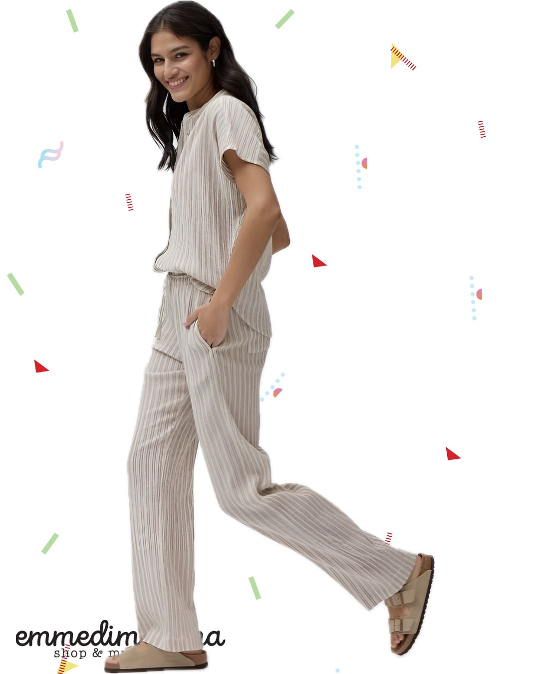 Questa blusa a maniche corte è a righe scure e con collo alla coreana. Cosa la rende speciale e unica? La sua raffinata struttura dobby.