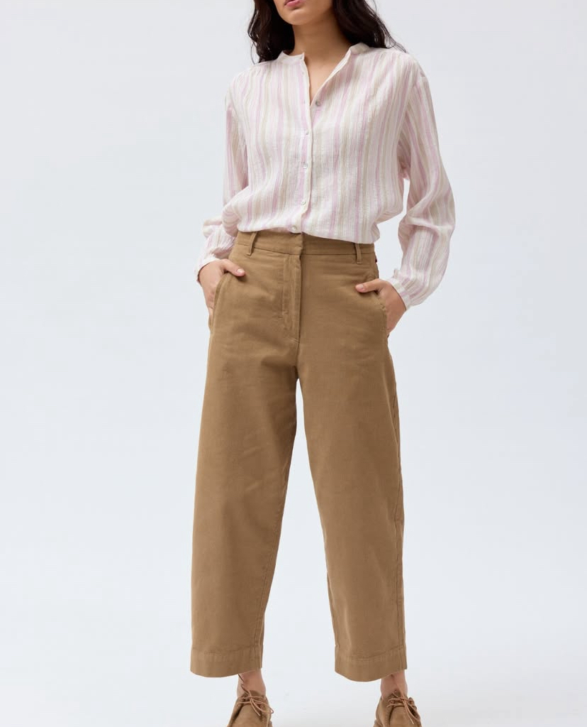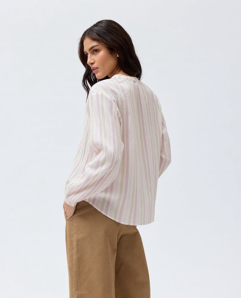 Questa è una camicia a tenui righe sottili rosa e beige, con raffinata struttura dobby, e il collo alla coreana. Il tessuto seppur semplice e leggero, ha una superficie ricca e sofisticata, con giochi di luce e texture.