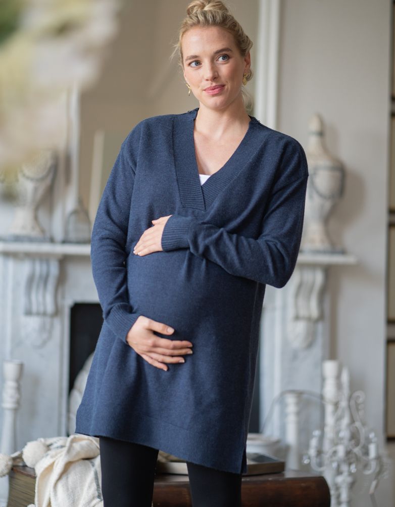 Morbido, elegante e super pratico: questo maxi-abito in maglia blu navy è pensato per accompagnarti durante la gravidanza e anche dopo la nascita del tuo bebè.